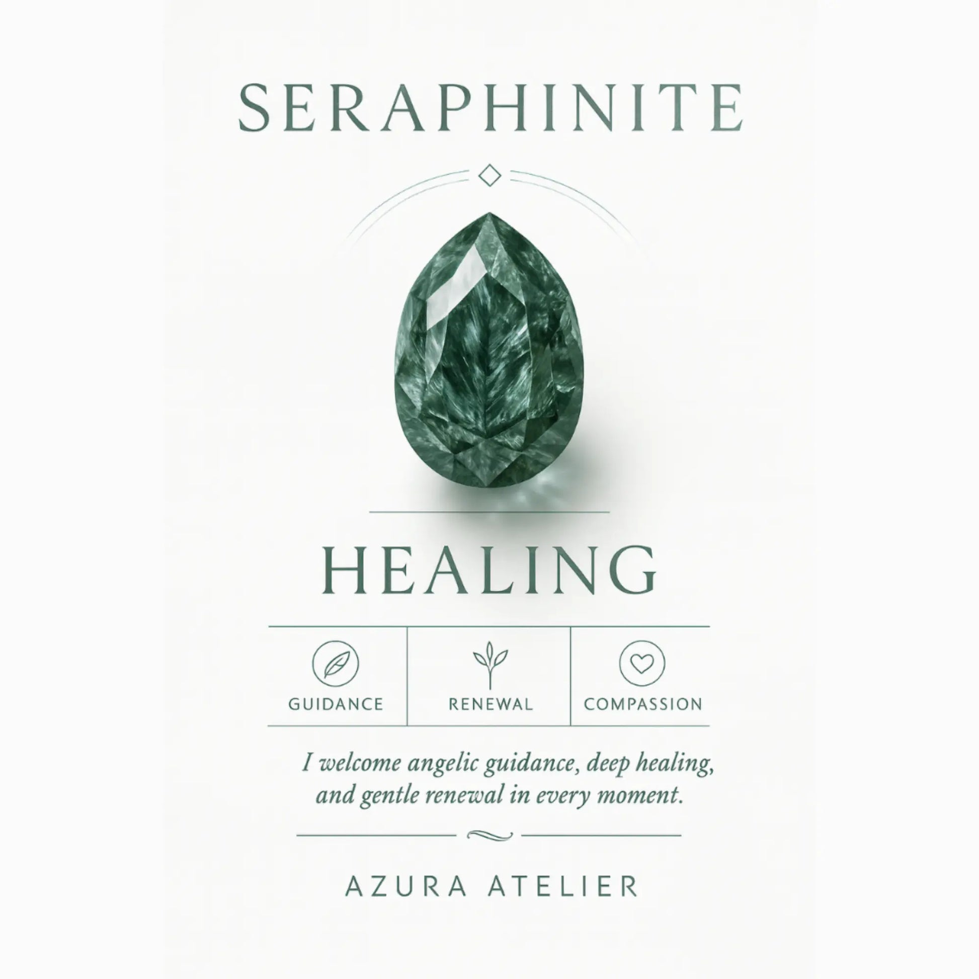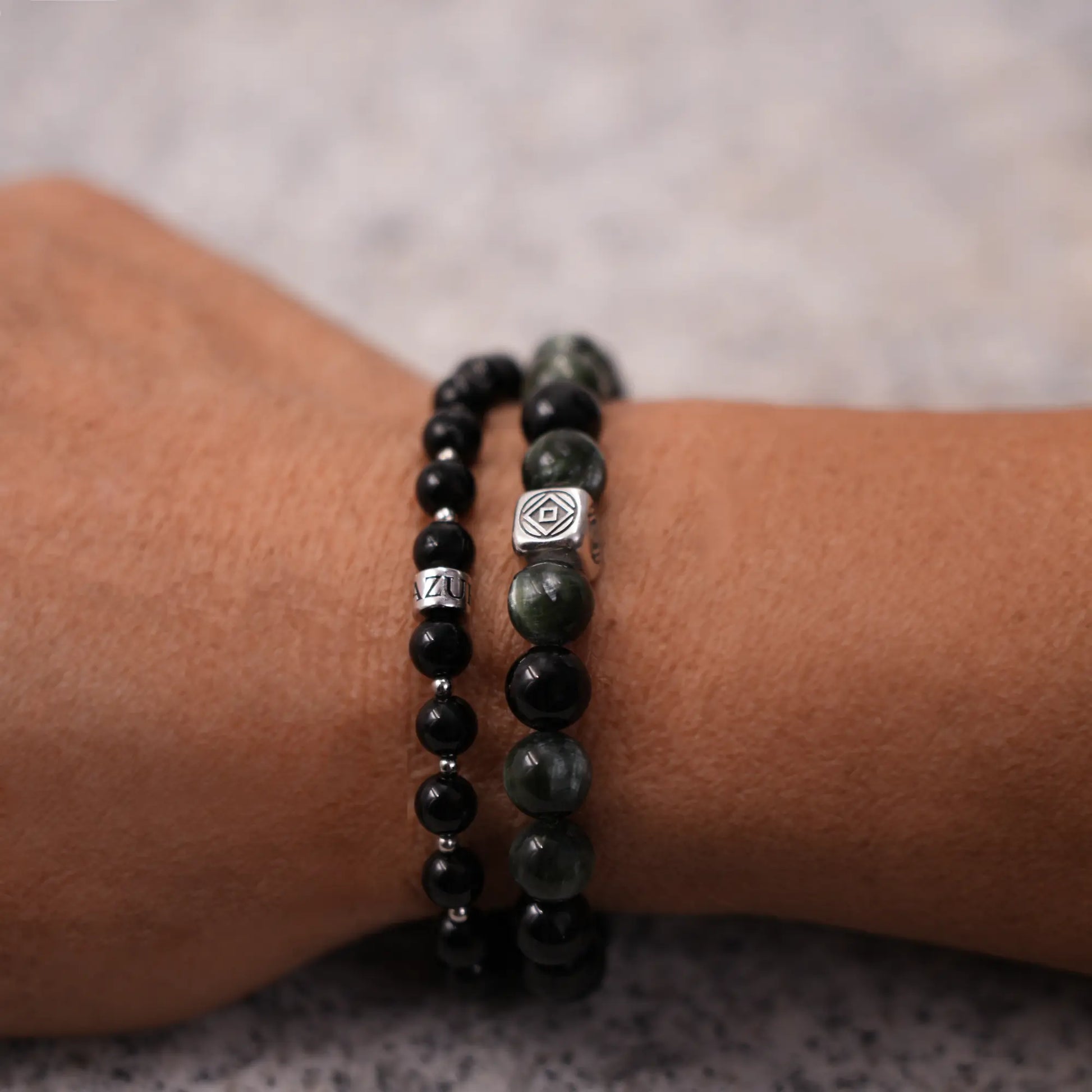 Part of the AzuraVintique collection, our Seraphic Shield Bracelet pairs Black Tourmaline with Seraphinite for grounded protection and soothing heart balance. Black Tourmaline is deep jet‑black with natural vertical striations valued for steady grounding, clear boundaries, and protective calm. Seraphinite is rich green with a silvery, feather‑like shimmer known for gentle harmony and emotional renewal. Worn together, they feel like calm resilience with an open, steady heart.